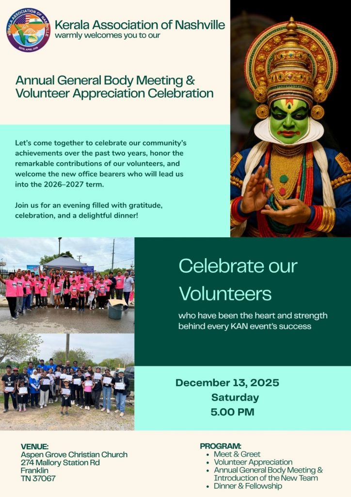 Join us for the Kerala Association of Nashville’s Annual General Body Meeting & Volunteer Appreciation Celebration on December 13, 2025, at Aspen Grove Christian Church in Franklin.